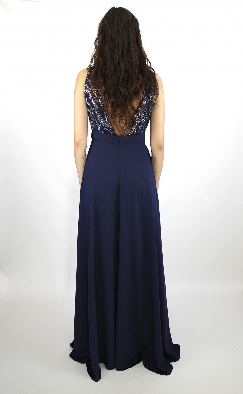Abito da Cerimonia realizzato in Cady blu notte e pizzo d'Alta Moda finemente ricamato a paillette.